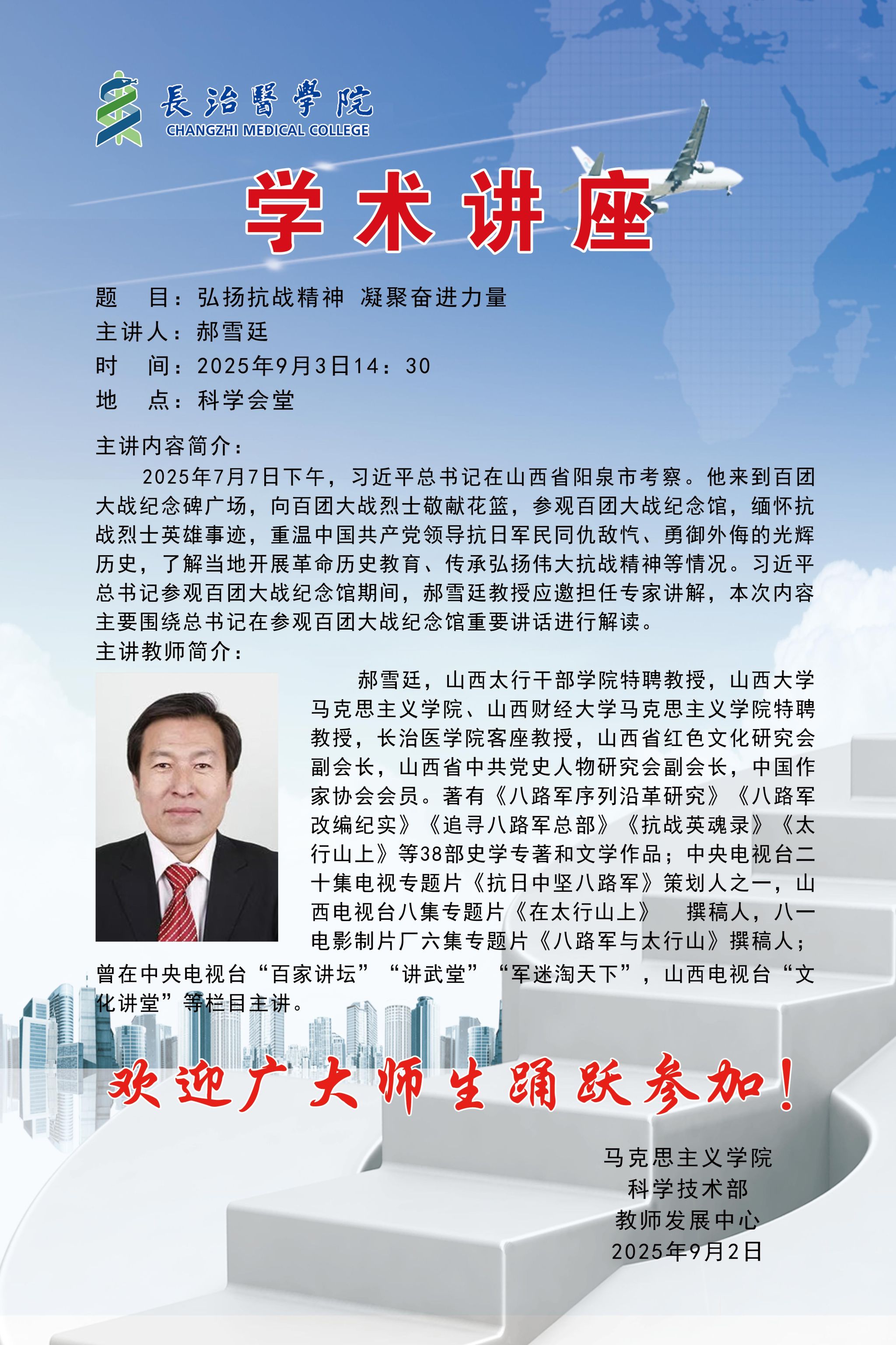 题 目:弘扬抗战精神 凝聚奋进力量主讲人:郝雪廷 教授时 间:2025年9月3日 下午14:30地 点:科学会堂主讲内容简介:2025年7月7日下午,习近平总书记在山西省阳泉市考察。他来到百团大战纪念碑广场,向百团大...